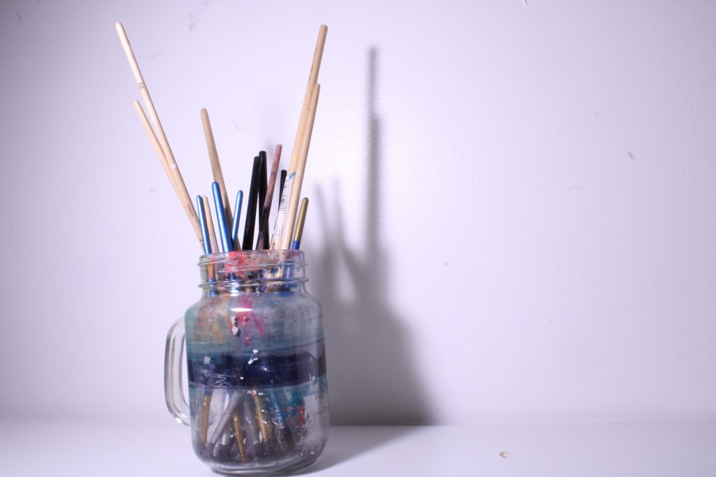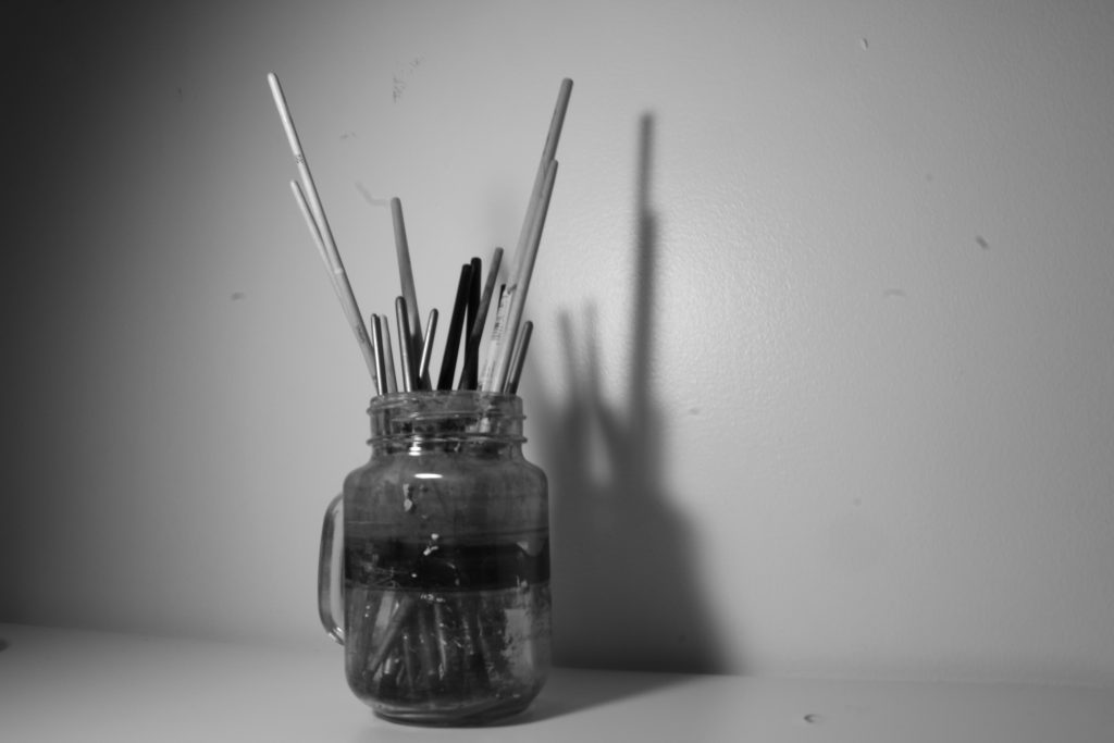 I like both the color and the b&w jar of brushes. I love the light purple in the color one – it is my fave color – great shadows on the wall.